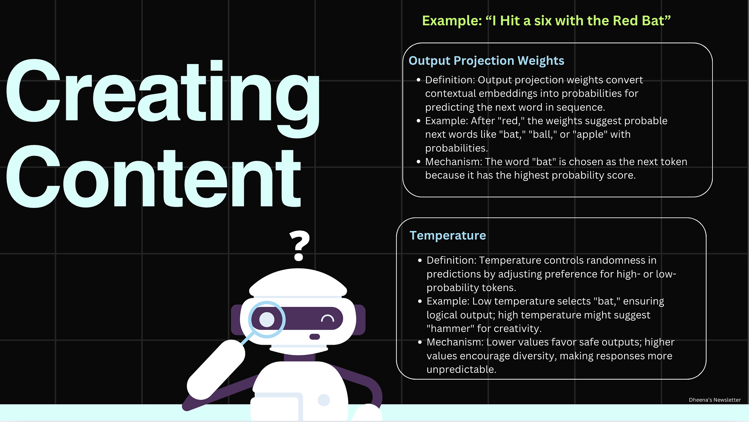 You might be thinking, "Okay, so models generate content by predicting the next most likely word based on their training data, repeating this process to form a complete answer." But how do models generate creative stories? This is where a concept called "temperature" comes into play.